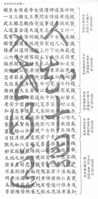 今日為師送徒一份禮,將今年度國內壇主班訓文,取正仁本訓第二段、苗栗、正茂、普化,與今日之鎮壇依序排列,由左至右,由上至下,集成本訓。菲律賓〈孝〉宇妙訓之本訓,即為〈人知十恩入世行道〉之訓中訓,行草書體,明白嗎?
